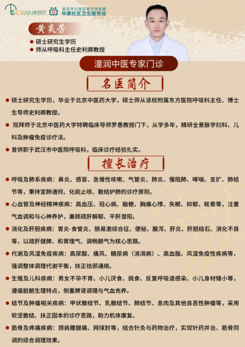 曾供职于武汉市中医院呼吸科的黄炎芳主任,定期于武汉潼润医院(汉口院区)坐诊,武汉潼润医院名中医专家团队再升级。